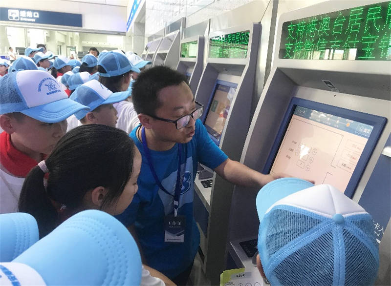 在雅安火車站行政辦公樓旁的操場上,運(yùn)通公司工作人員就雅安火車站相關(guān)情況向孩子們進(jìn)行了簡單介紹,對孩子們提出的問題進(jìn)行了一一解答。下午4點(diǎn)13分,伴隨響亮的鳴笛聲,一輛動(dòng)車駛出站臺(tái),孩子們歡呼雀躍,興奮不已。在雅安火車站售票大廳,運(yùn)通公司員工向孩子們講解了自助購、取票操作流程。