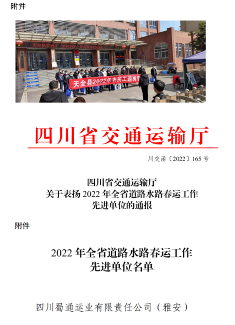 蜀通公司認(rèn)真落實各級政府和行業(yè)主管部門有關(guān)春運工作的安排部署,堅持以“冬安行動”為抓手,全力以赴做好春運期間運輸安全和疫情防控,確保全市交通運輸暢通、民生出行順利。2022年春運期間,共投入班線車輛16546臺,發(fā)班21269班次,其中加班422班次,安全運送旅客26余萬人次,圓滿完成2022年春運工作,被四川省交通運輸廳評為“2022年全省道路水路春運工作先進單位”。