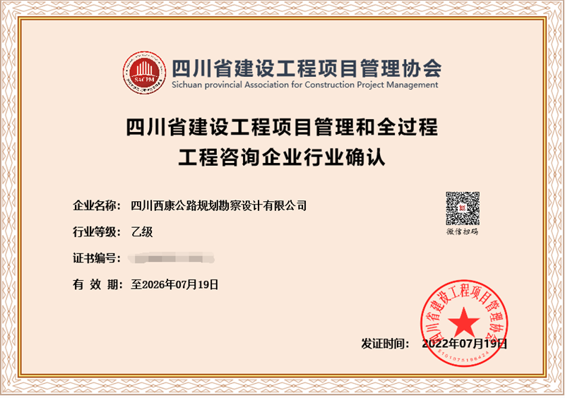日前,經(jīng)四川省建設(shè)工程項(xiàng)目管理協(xié)會評審,交建集團(tuán)四川西康公路規(guī)劃勘察設(shè)計有限公司獲得“四川省建設(shè)工程項(xiàng)目管理和全過程工程咨詢企業(yè)行業(yè)乙級資格”確認(rèn),成為四川省內(nèi)為數(shù)不多獲得開展全過程項(xiàng)目管理和咨詢資質(zhì)企業(yè)之一。