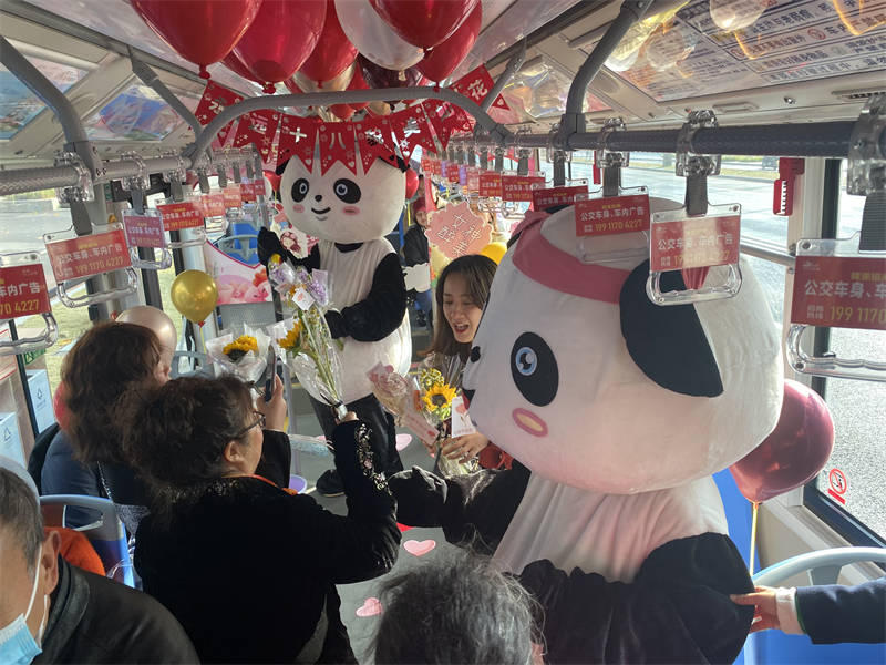 上午9點(diǎn)10分,精心打造的5路公交車從雅安市公交總站臺出發(fā),該車車身“穿戴”上粉色的蝴蝶結(jié),“頭戴”女神號“皇冠”,車身外印著“帶著你的鋒芒 做自己的女王”“你活得漂亮 世界才溫柔”等節(jié)日祝福標(biāo)語,車廂內(nèi)“甜美粉”元素以及人形玩偶大熊貓“雅雅”“安安”送上的鮮花和“女神節(jié)快樂!”深深祝福,同時為女性乘客提供“女神相框”拍照打卡點(diǎn),讓每一位女乘客感受到了節(jié)日的溫馨、浪漫。