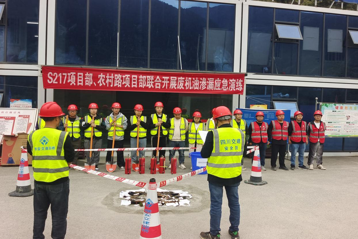 為提高項目管理人員與勞務(wù)人員應(yīng)對廢機(jī)油滲漏突發(fā)事件的能力,10月25日,雅安交建集團(tuán)路橋公司S217石棉縣王崗坪至石棉縣城段災(zāi)后恢復(fù)重建工程項目部、“9.5”瀘定地震石棉縣受損農(nóng)村公路災(zāi)后恢復(fù)重建工程項目部、石棉縣農(nóng)村公路改造提升工程項目部,聯(lián)合開展環(huán)保廢機(jī)油處置應(yīng)急演練。