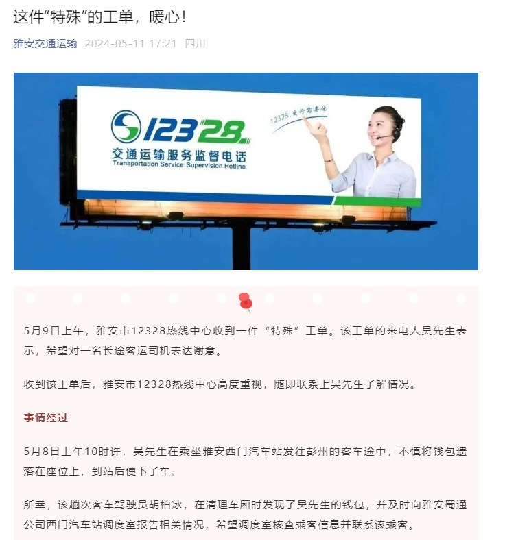 5月8日上午,乘客吳先生在乘坐蜀通公司客車時,不慎將錢包遺落在座位上。司機胡柏冰在清理車廂衛(wèi)生時發(fā)現(xiàn)了這個錢包,他立即向蜀通公司西門車站調(diào)度室匯報,并在調(diào)度室的協(xié)助下,吳先生成功取回了自己的錢包。雅安市12328熱線中心在接到吳先生的反饋后,對蜀通公司的服務(wù)和司機胡柏冰的善舉給予了高度評價,并通過雅安交通局公眾號進(jìn)行了宣傳表揚。