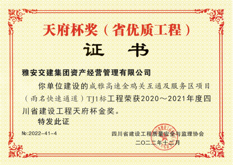 近日,雅安交建集團(tuán)資產(chǎn)經(jīng)營管理有限公司建設(shè)的成雅高速金雞關(guān)互通及服務(wù)區(qū)項(xiàng)目(雨名快速通道)TJ1標(biāo)工程榮獲2020-2021年度四川省建設(shè)工程天府杯金獎(jiǎng)。