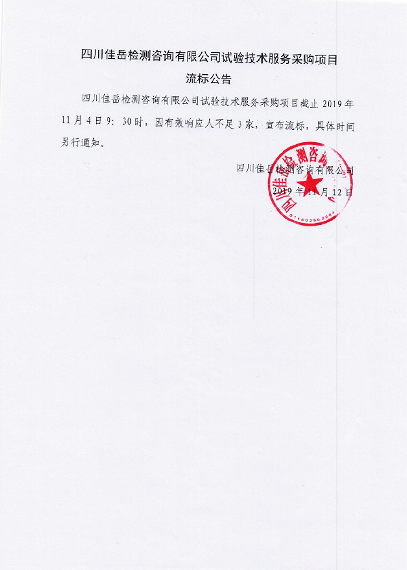 四川佳岳檢測(cè)咨詢有限公司試驗(yàn)技術(shù)服務(wù)采購(gòu)項(xiàng)目流標(biāo)公告