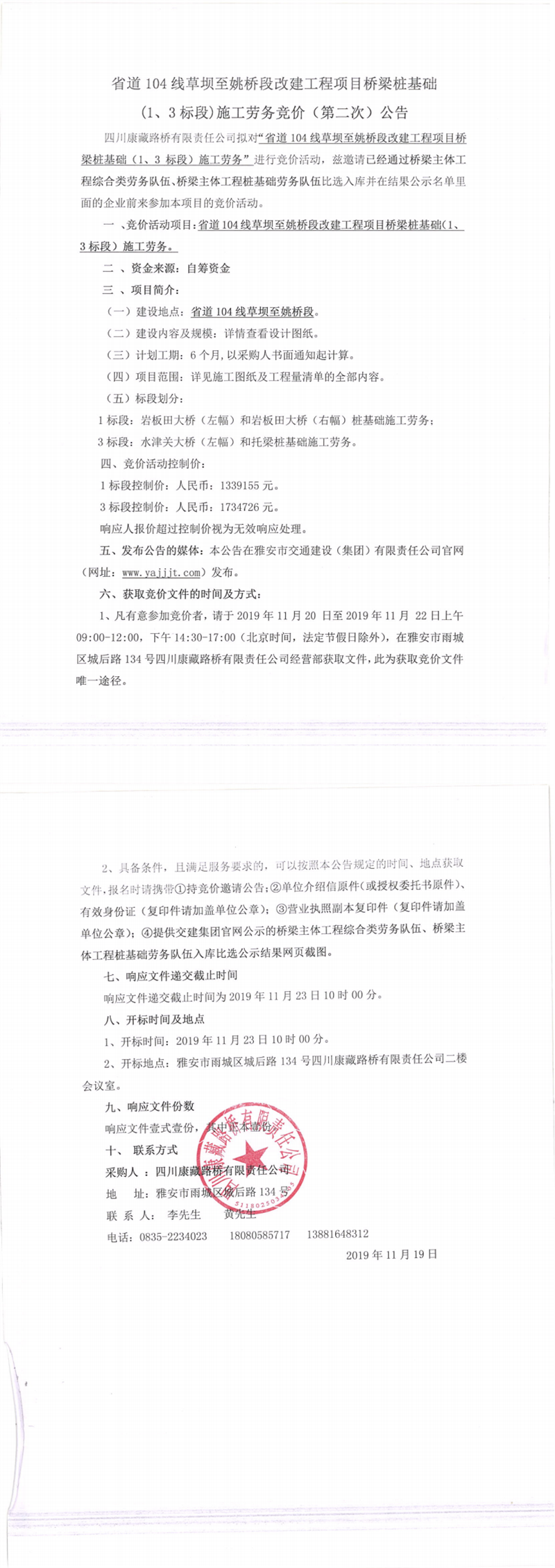 四川康藏路橋有限責(zé)任公司省道104線草壩至姚橋段改建工程項(xiàng)目橋梁樁基礎(chǔ)(1、3標(biāo)段)施工勞務(wù)競價(jià)(第二次)公告