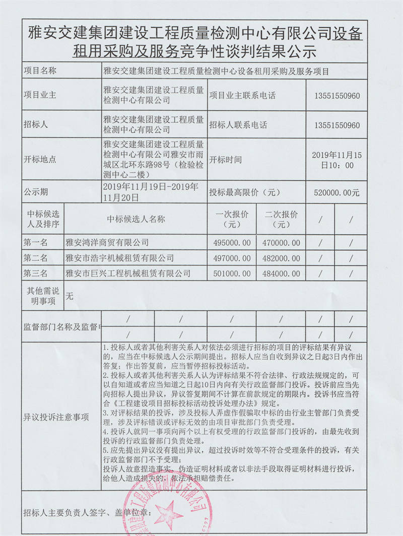 雅安交建集團(tuán)建設(shè)工程質(zhì)量檢測(cè)中心有限公司設(shè)備租用采購(gòu)及服務(wù)競(jìng)爭(zhēng)性談判結(jié)果公示