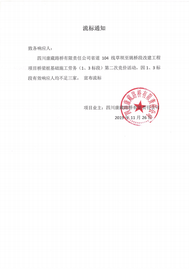 四川康藏路橋有限責(zé)任公司省道104線草壩至姚橋段改建工程項(xiàng)目橋梁樁基礎(chǔ)(1、3標(biāo)段)施工勞務(wù)競(jìng)價(jià)(第二次)流標(biāo)通知