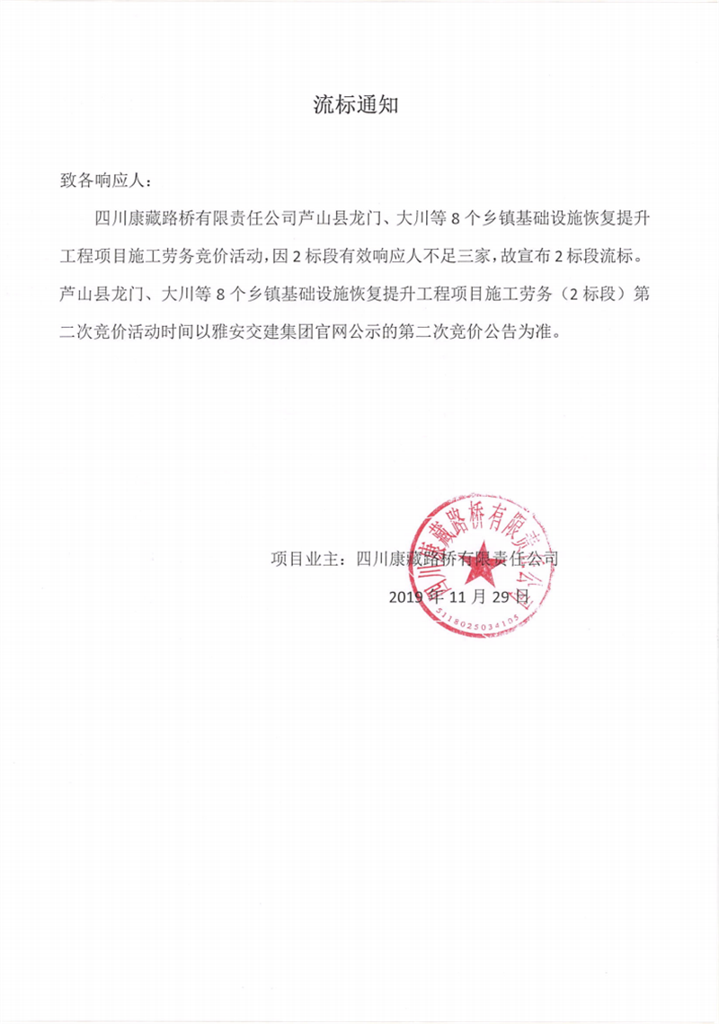 四川康藏路橋有限責(zé)任公司蘆山縣龍門(mén)、大川等8個(gè)鄉(xiāng)鎮(zhèn)基礎(chǔ)設(shè)施恢復(fù)提升工程項(xiàng)目施工勞務(wù)(2標(biāo)段)競(jìng)價(jià)流標(biāo)通知