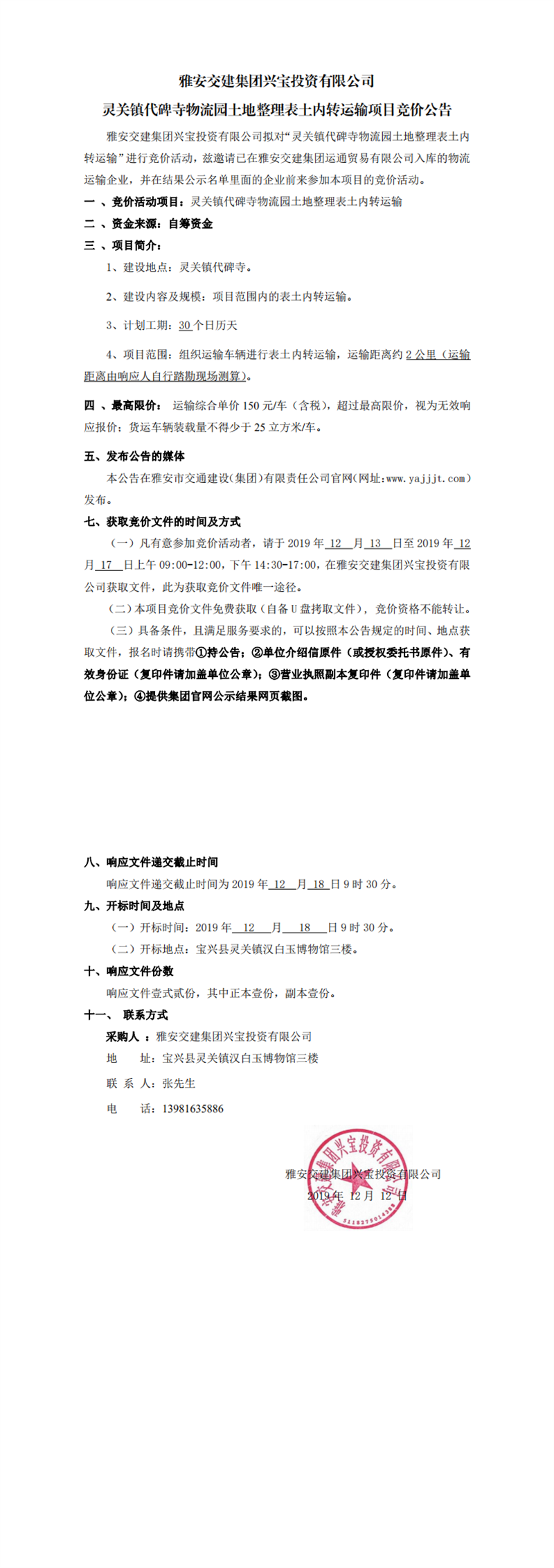 雅安交建集團興寶投資有限公司靈關鎮(zhèn)代碑寺物流園土地整理表土內(nèi)轉運輸項目競價公告