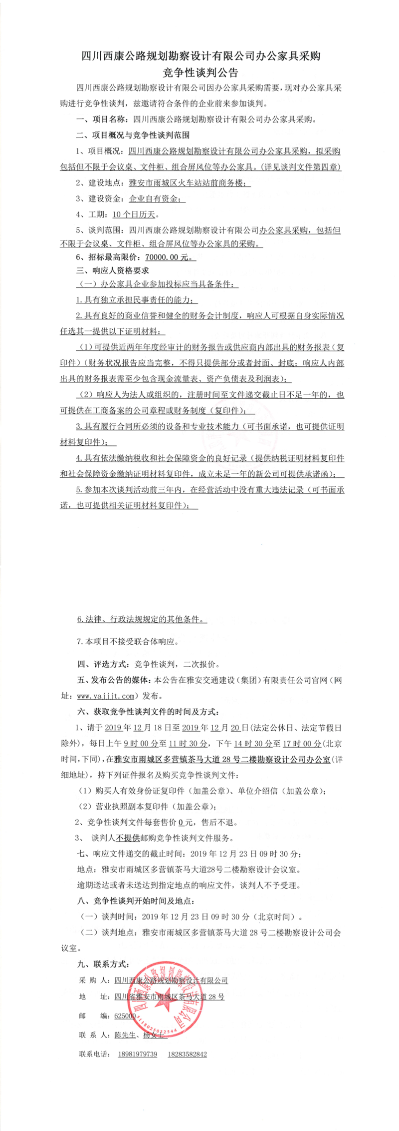 四川西康公路規(guī)劃勘察設計有限公司辦公家具采購競爭性談判公告