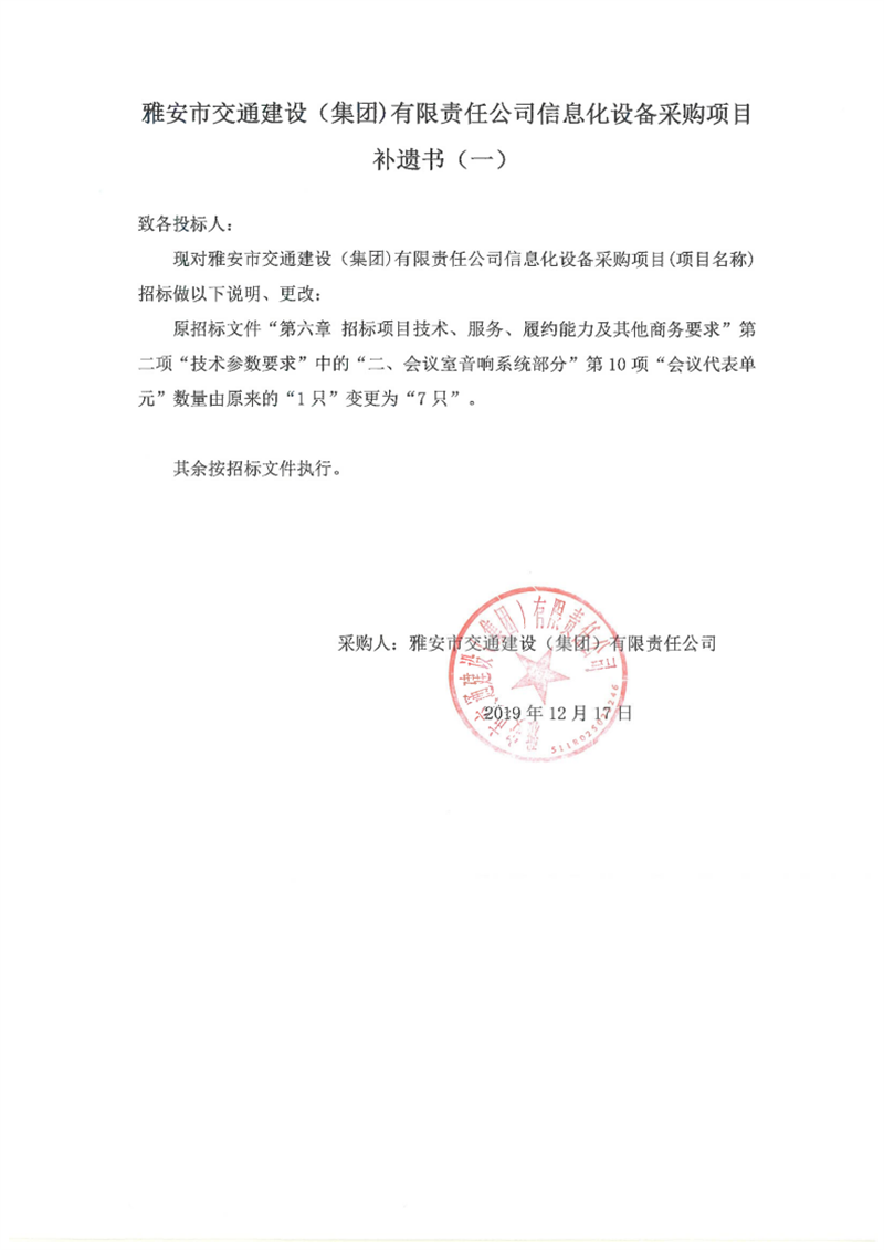 雅安市交通建設(shè)(集團(tuán))有限責(zé)任公司信息化設(shè)備采購項目補(bǔ)遺書(一)