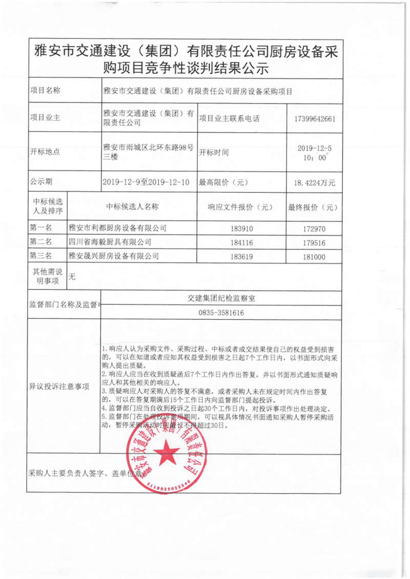 雅安市交通建設(集團)有限責任公司廚房設備采購項目競爭性談判結果公示