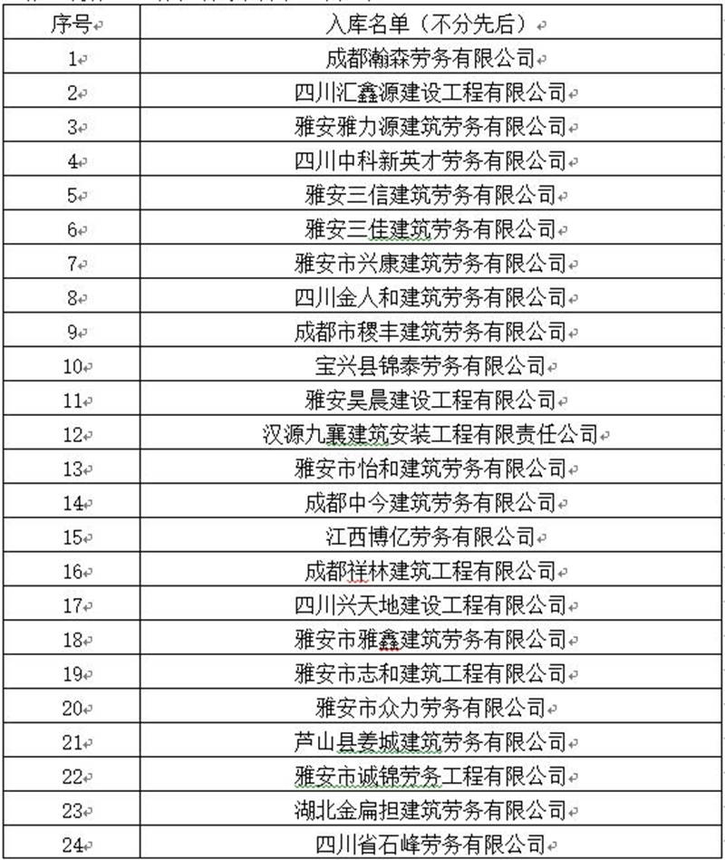 雅安交建集團(tuán)路橋有限責(zé)任公司勞務(wù)服務(wù)入庫(kù)比選項(xiàng)目于2019年5月11日完成開評(píng)標(biāo)工作,現(xiàn)將比選結(jié)果即入庫(kù)名單公示如下: