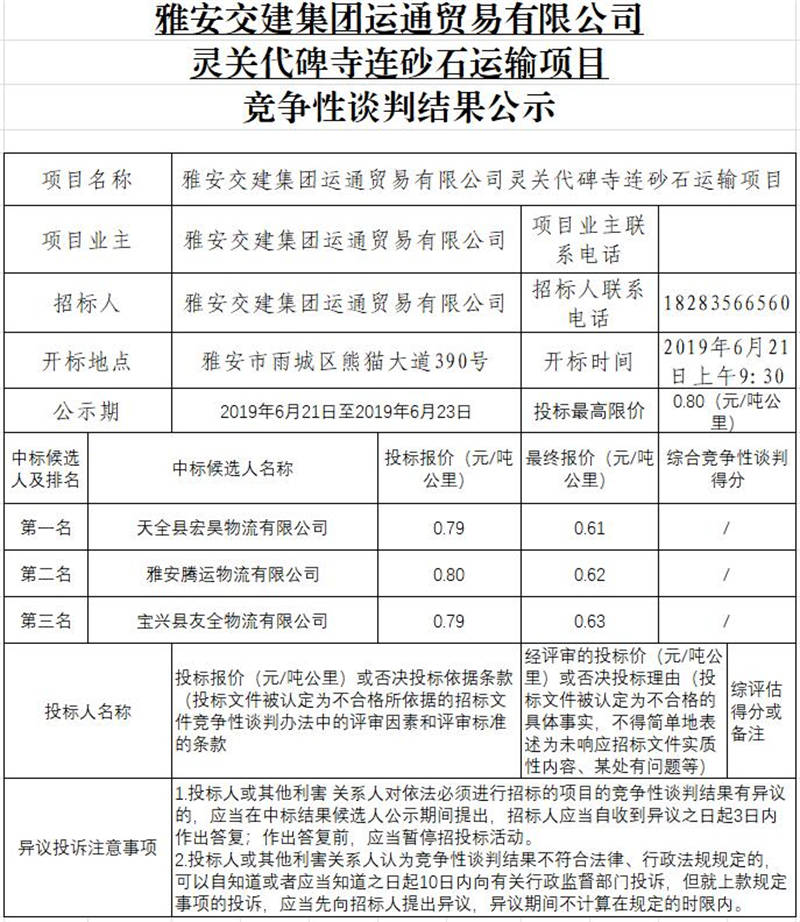 雅安交建集團(tuán)運(yùn)通貿(mào)易有限公司靈關(guān)代碑寺連砂石運(yùn)輸項(xiàng)目競爭性談判結(jié)果公示