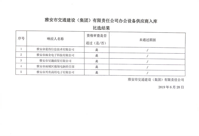 雅安市交通建設(shè)(集團)有限責任公司辦公設(shè)備供應(yīng)商入庫比選結(jié)果