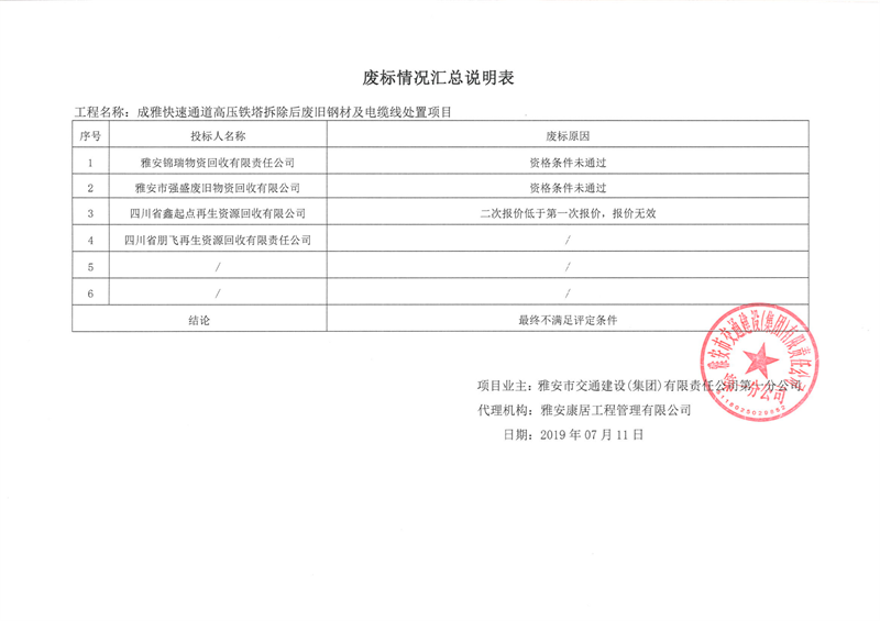 雅安市交通建設(shè)(集團)有限責(zé)任公司第一分公司成雅快速通道高壓鐵塔拆除后廢舊鋼材及電纜線處置項目廢標(biāo)情況匯總說明表
