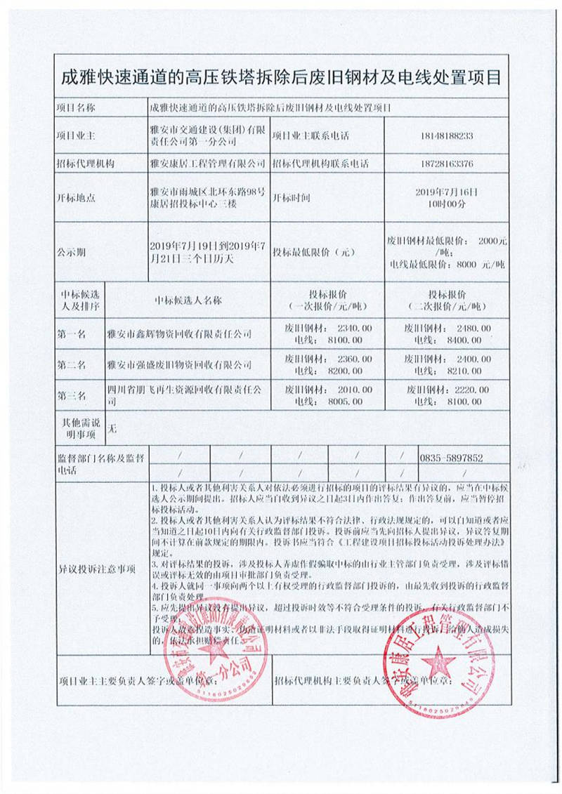 雅安市交通建設(shè)(集團)有限責任公司第一分公司成雅快速通道的高壓鐵塔拆除后廢舊鋼材及電線處置項目競價結(jié)果公示