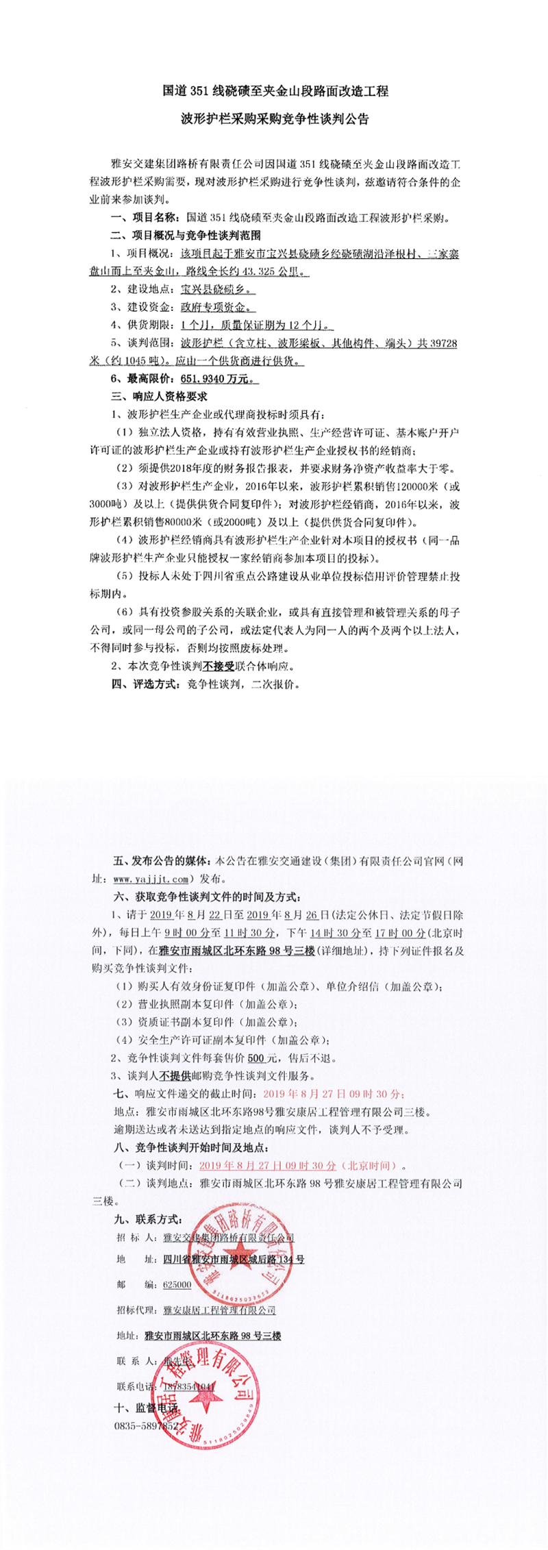 雅安交建集團(tuán)路橋有限責(zé)任公司國(guó)道351線磽磧至夾金山段路面改造工程波形護(hù)欄采購(gòu)項(xiàng)目競(jìng)爭(zhēng)性談判公告