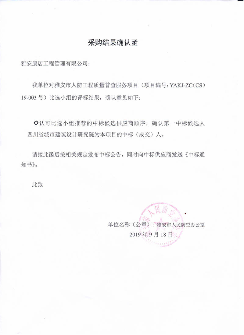 雅安市人民防空辦公室雅安市人防工程質(zhì)量普查服務(wù)項(xiàng)目評標(biāo)結(jié)果公示