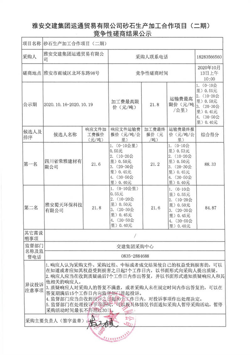 雅安交建集團運通貿(mào)易有限公司砂石生產(chǎn)加工合作項目(二期)競爭性磋商結果公示