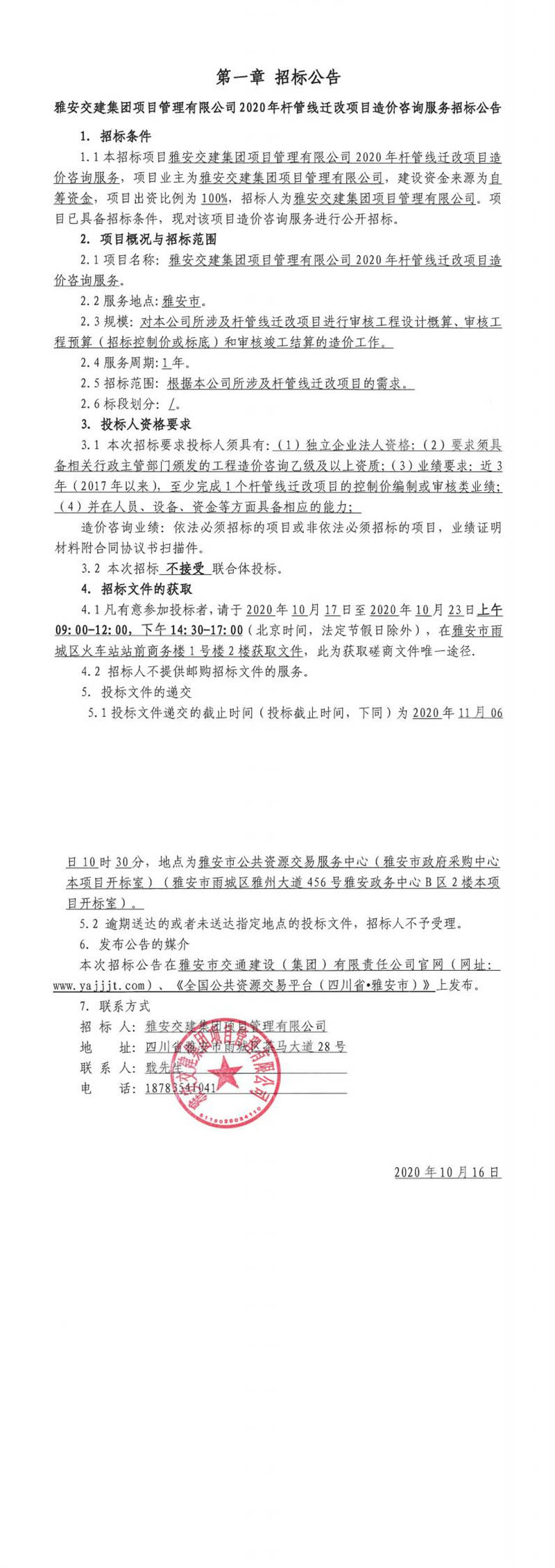 雅安交建集團項目管理有限公司2020年桿管線遷改項目造價咨詢服務(wù)招標(biāo)公告
