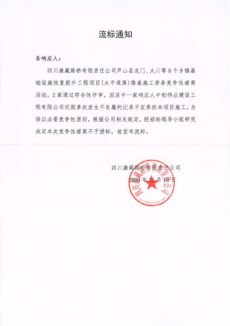 四川康藏路橋有限責任公司蘆山縣龍門、大川等8個鄉(xiāng)鎮(zhèn)基礎設施恢復提升工程項目(太平道路)路基施工勞務流標通知