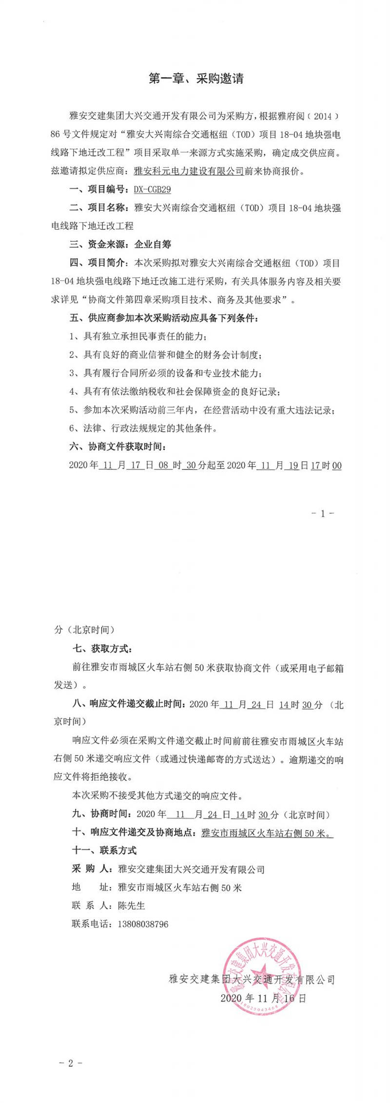 雅安交建集團(tuán)大興交通開發(fā)有限公司雅安大興南綜合交通樞紐(TOD)項(xiàng)目18-04地塊強(qiáng)電線路下地遷改工程單一來源采購邀請(qǐng)