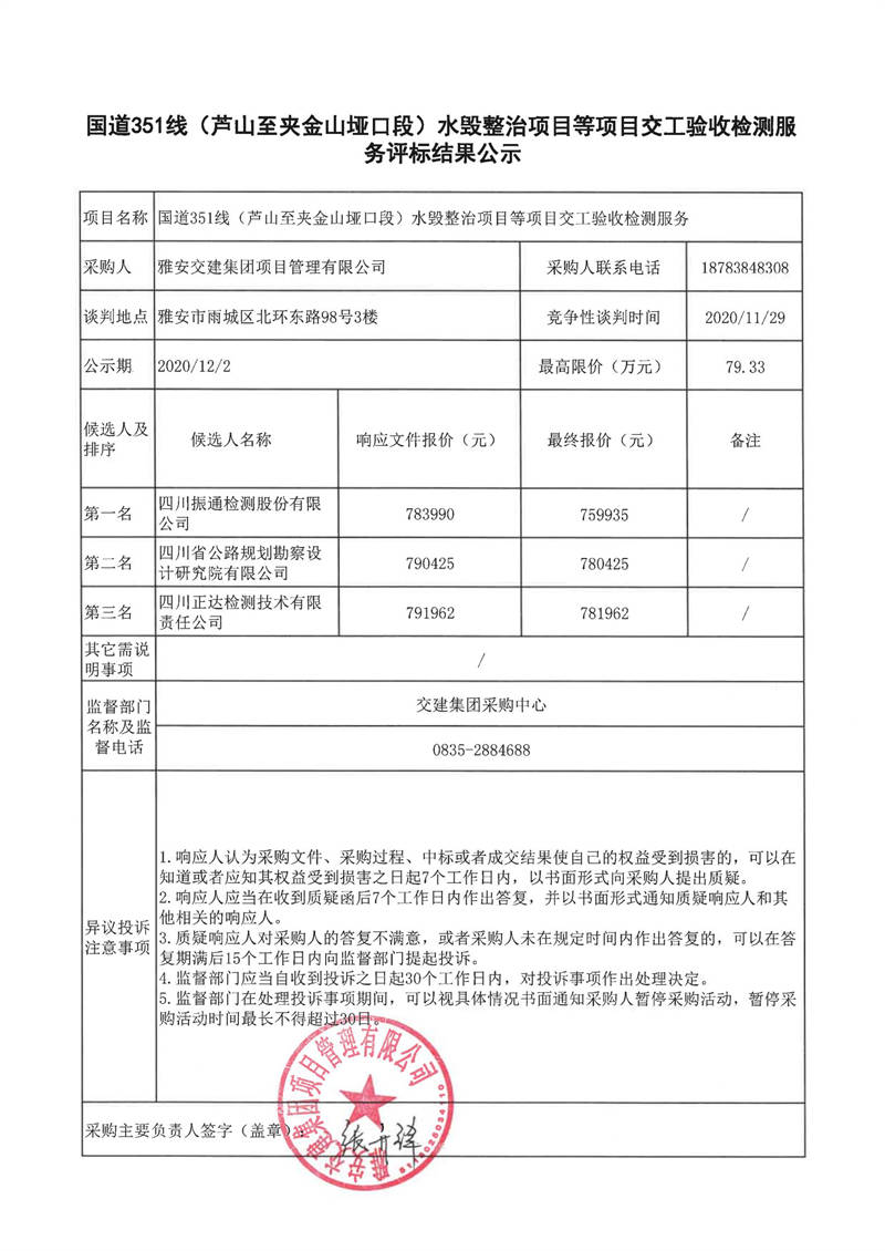 雅安交建集團(tuán)項(xiàng)目管理有限公司國道351線(蘆山至夾金山埡口段)水毀整治項(xiàng)目等項(xiàng)目交工驗(yàn)收檢測服務(wù)評標(biāo)結(jié)果公示