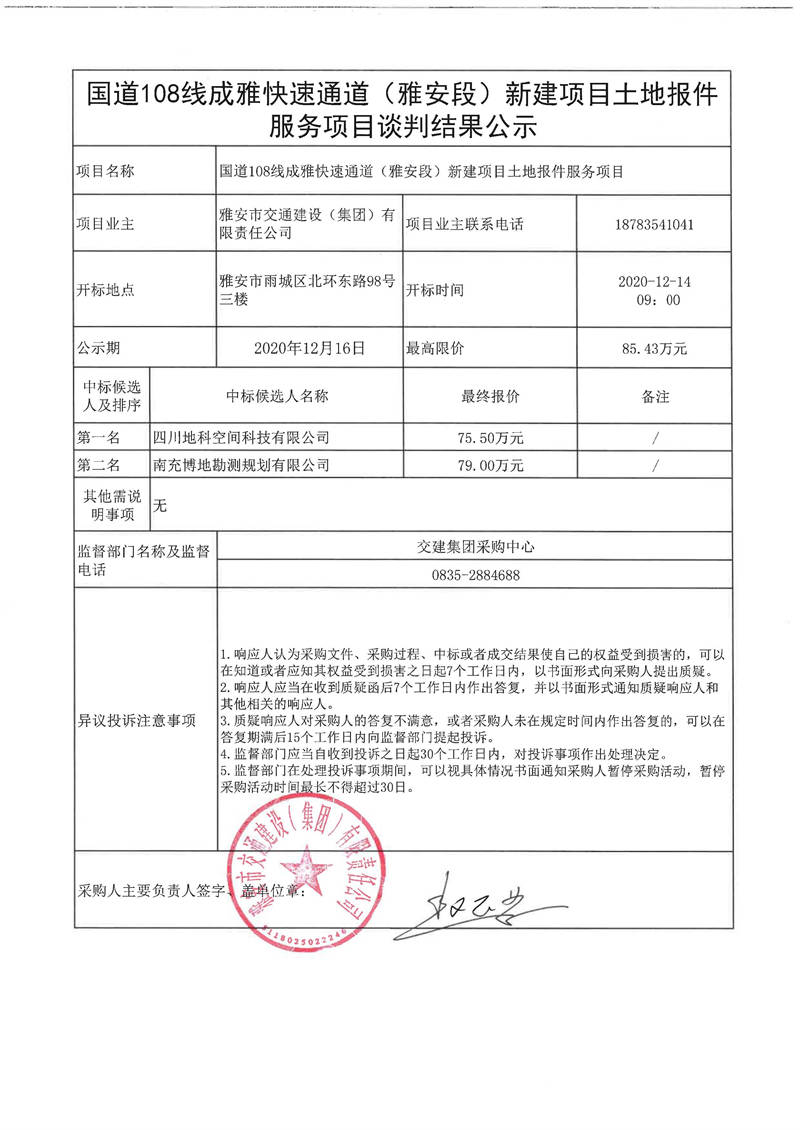 雅安市交通建設(集團)有限責任公司國道108線成雅快速通道(雅安段)新建項目土地報件服務項目談判結果公示