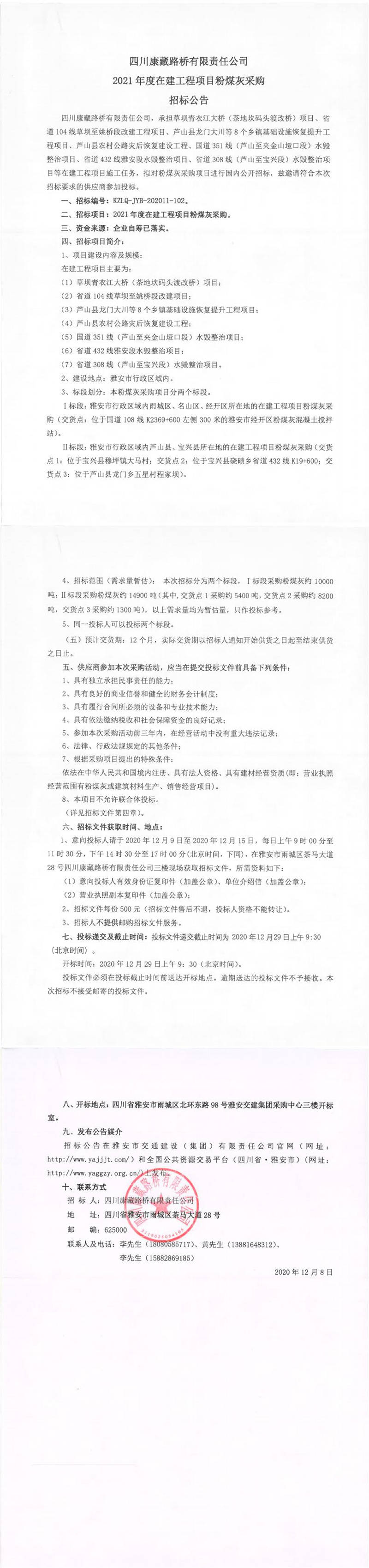 四川康藏路橋有限責(zé)任公司2021年度在建工程項目粉煤灰采購招標(biāo)公告