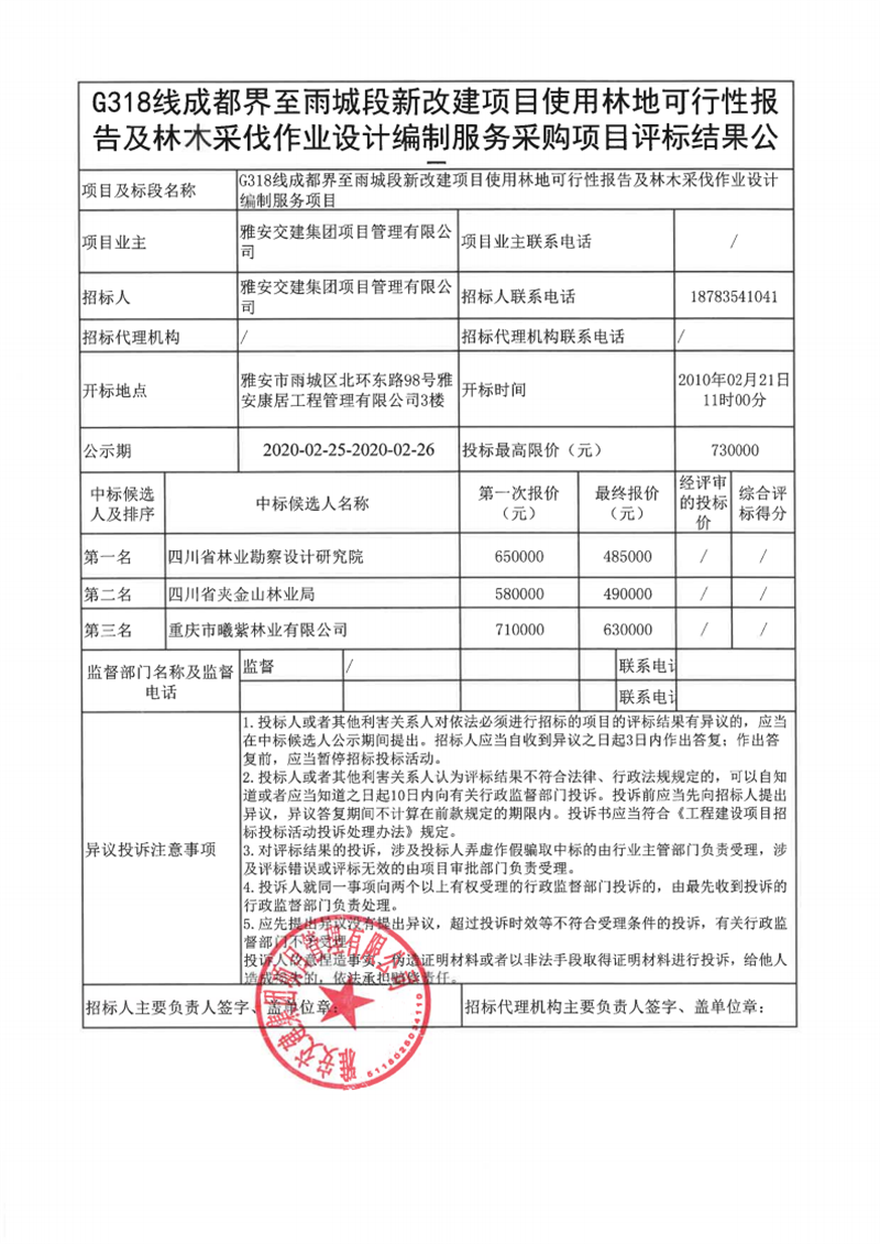 雅安交建集團(tuán)項(xiàng)目管理有限公司G318線成都界至雨城段新改建項(xiàng)目使用林地可行性報告及林木采伐作業(yè)設(shè)計編制服務(wù)采購項(xiàng)目評標(biāo)結(jié)果公示