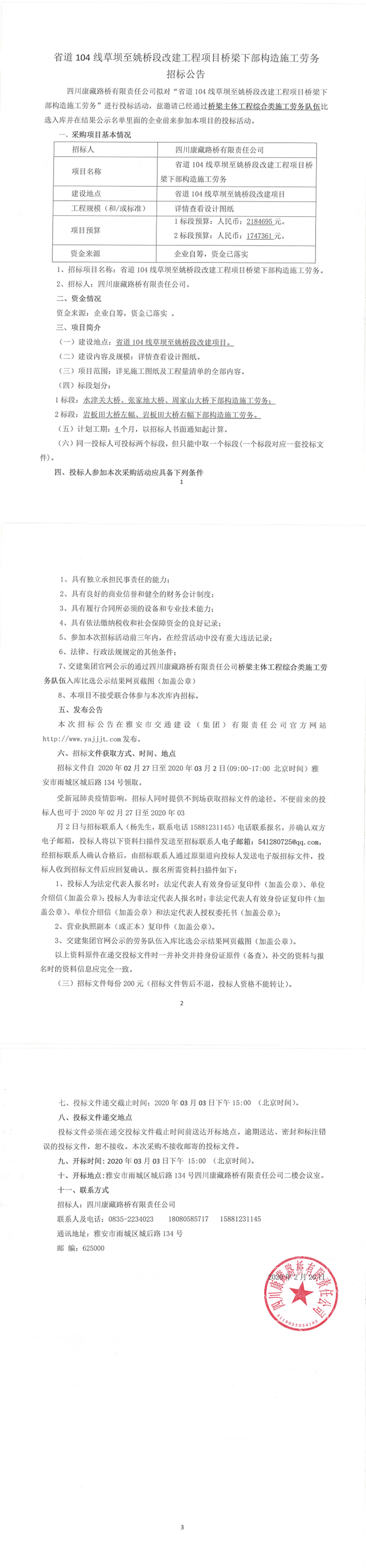 四川康藏路橋有限責任公司省道104線草壩至姚橋段改建工程項目橋梁下部構造施工勞務招標公告