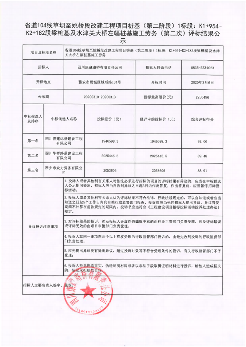 四川康藏路橋有限責(zé)任公司省道104線草壩至姚橋段改建工程項(xiàng)目樁基(第二階段)1標(biāo)段:K1+954-K2+182段梁樁基及水津關(guān)大橋左幅樁基施工勞務(wù)(第二次)評(píng)標(biāo)結(jié)果公示