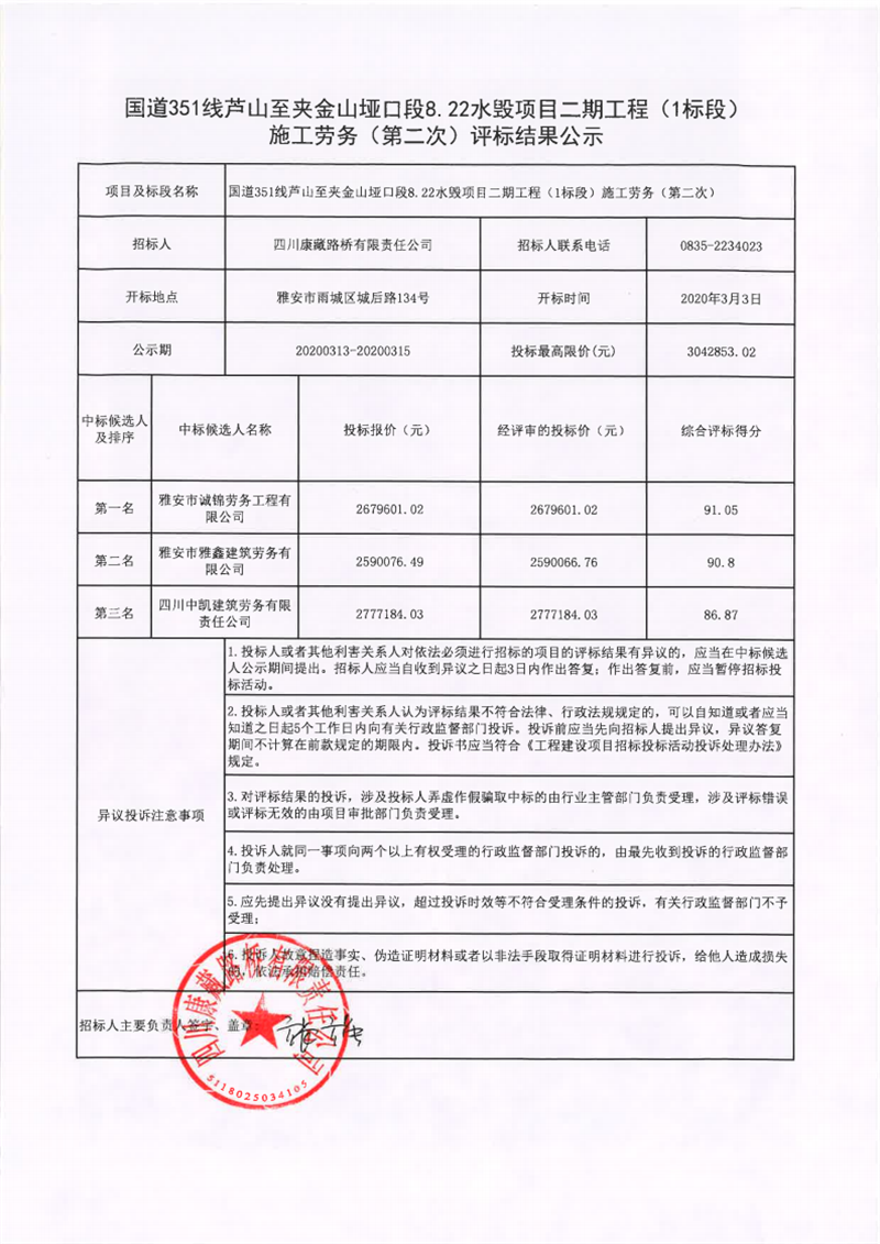 四川康藏路橋有限責(zé)任公司國道351線蘆山至夾金山埡口段8.22水毀項目二期工程(1標(biāo)段)施工勞務(wù)(第二次)評標(biāo)結(jié)果公示