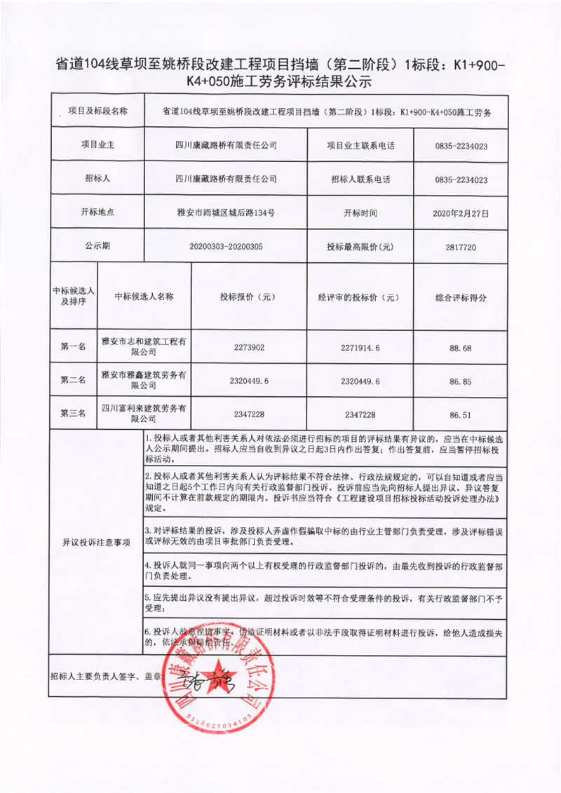 四川康藏路橋有限責(zé)任公司省道104線草壩至姚橋段改建工程項(xiàng)目擋墻(第二階段)1標(biāo)段:K1+900-K4+050施工勞務(wù)評(píng)標(biāo)結(jié)果公示