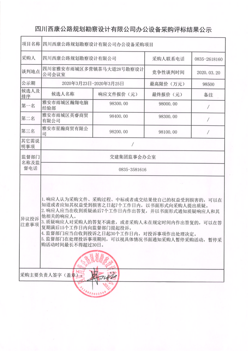四川西康公路規(guī)劃勘察設(shè)計有限公司辦公設(shè)備采購評標結(jié)果公示