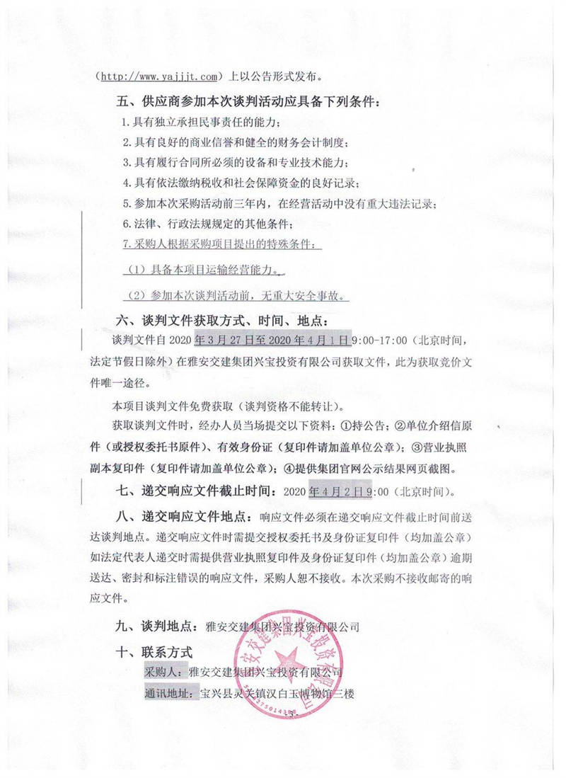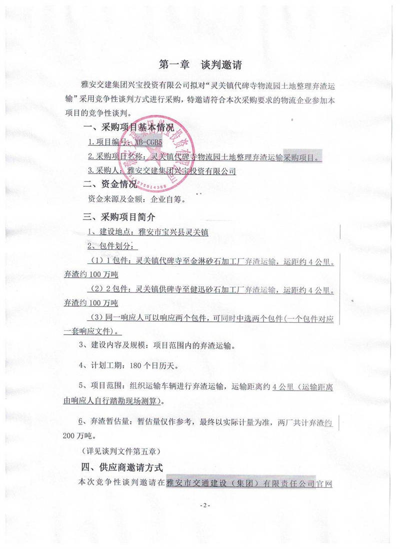 雅安交建集團(tuán)興寶投資有限公司靈關(guān)鎮(zhèn)代碑寺物流園土地整理棄渣運輸采購項目競爭性談判公告