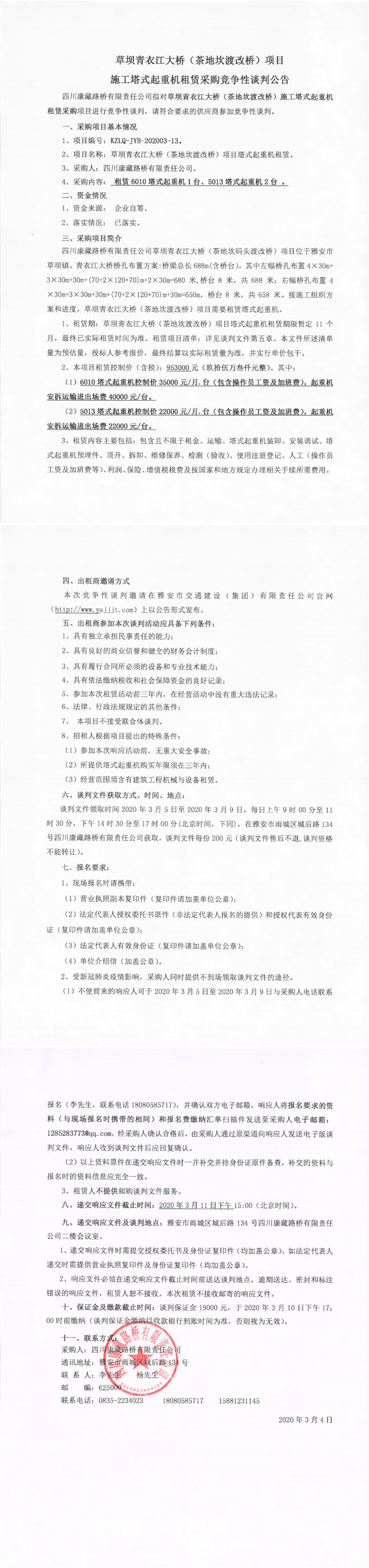 四川康藏路橋有限責(zé)任公司草壩青衣江大橋(茶地坎渡改橋)項目施工塔式起重機(jī)租賃采購競爭性談判公告