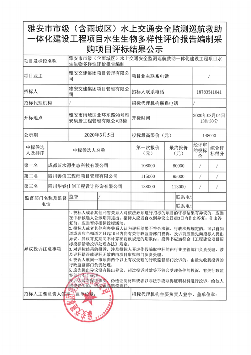 雅安交建集團項目管理有限公司雅安市市級(含雨城區(qū))水上交通安全監(jiān)測巡航救助一體化建設工程項目水生生物多樣性評價報告編制采購項目評標結果公示
