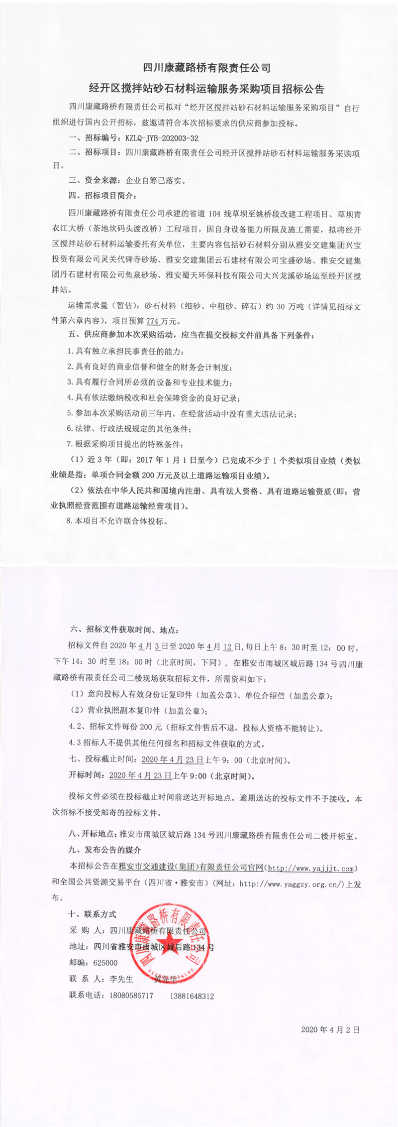 四川康藏路橋有限責(zé)任公司經(jīng)開區(qū)攪拌站砂石材料運(yùn)輸服務(wù)采購項目招標(biāo)公告