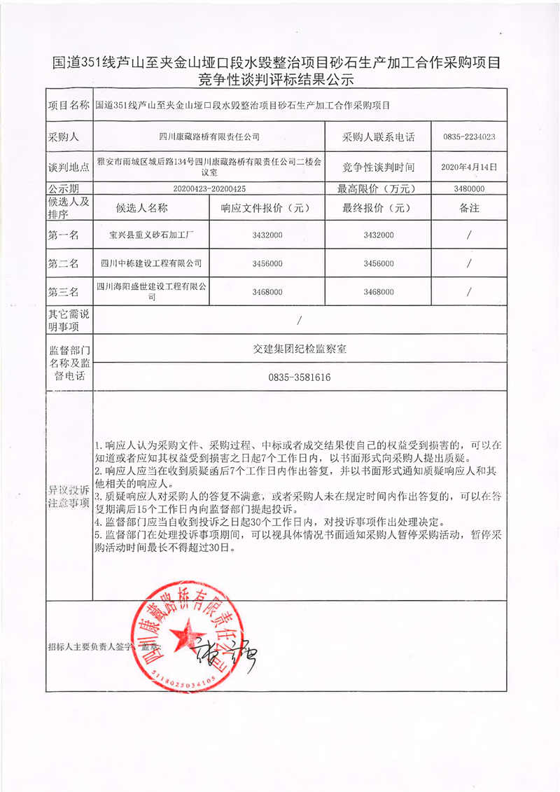 四川康藏路橋有限責(zé)任公司國道351線蘆山至夾金山埡口段水毀整治項(xiàng)目砂石生產(chǎn)加工合作采購項(xiàng)目競爭性談判評標(biāo)結(jié)果公示