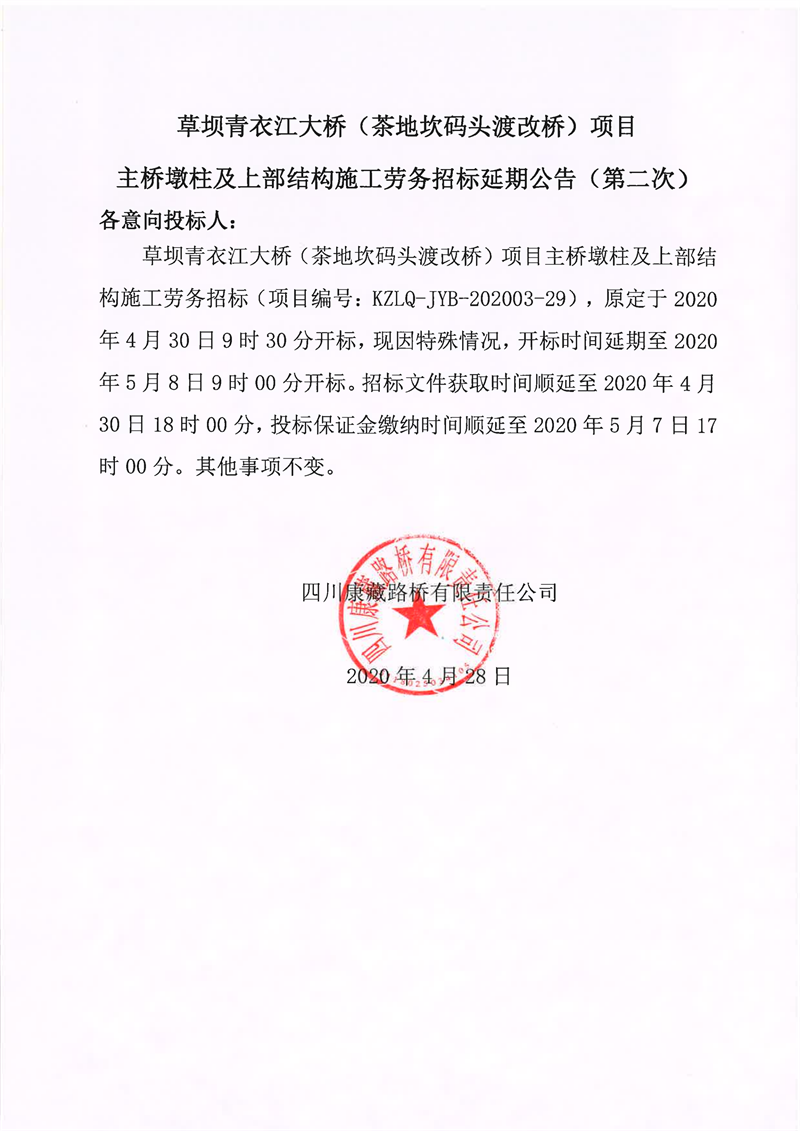 四川康藏路橋有限責(zé)任公司草壩青衣江大橋(茶地坎碼頭渡改橋)項(xiàng)目主橋墩柱及上部結(jié)構(gòu)施工勞務(wù)招標(biāo)延期公告(第二次)