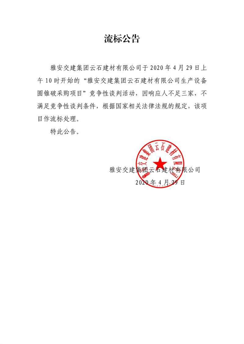 雅安交建集團(tuán)云石建材有限公司生產(chǎn)設(shè)備圓錐破采購(gòu)項(xiàng)目流標(biāo)公告