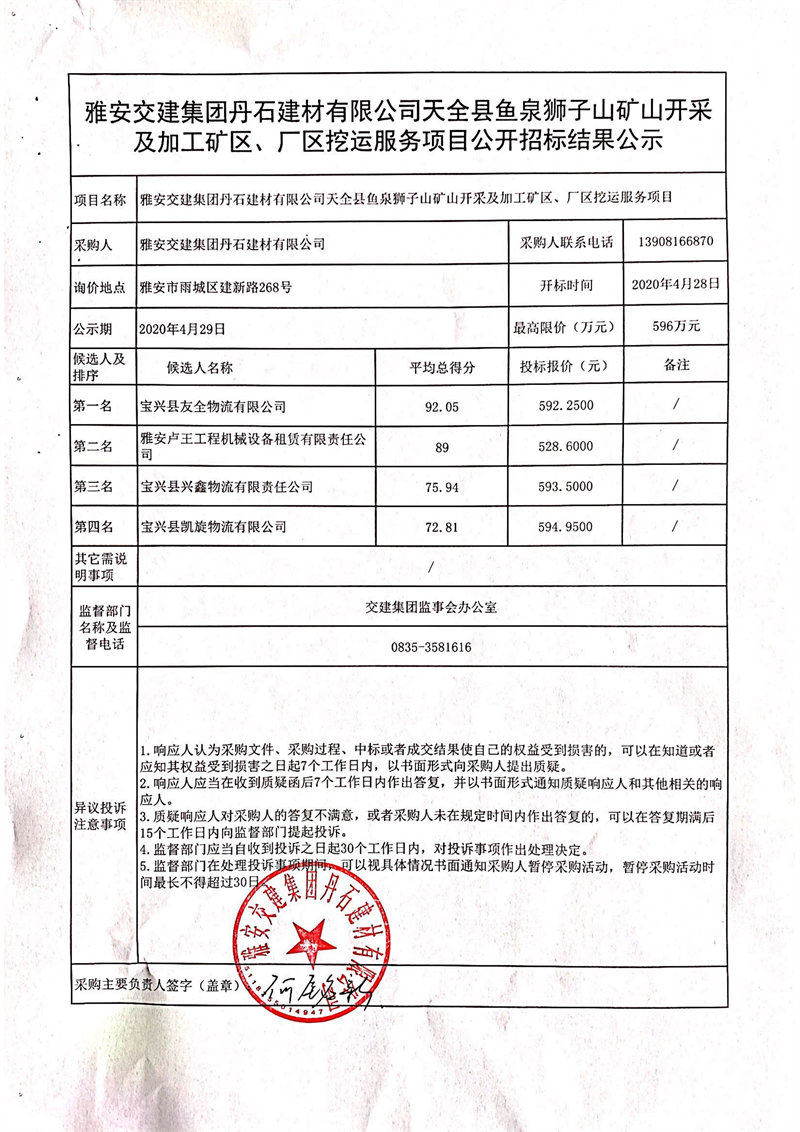 雅安交建集團(tuán)丹石建材有限公司天全縣魚泉獅子山礦山開采及加工礦區(qū)、廠區(qū)挖運(yùn)服務(wù)項(xiàng)目公開招標(biāo)結(jié)果公示