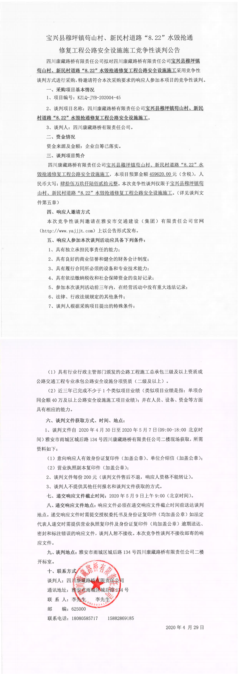 四川康藏路橋有限責任公司寶興縣穆坪鎮(zhèn)茍山村、新民村道路“8.22”水毀搶通修復工程公路安全設施施工競爭性談判公告