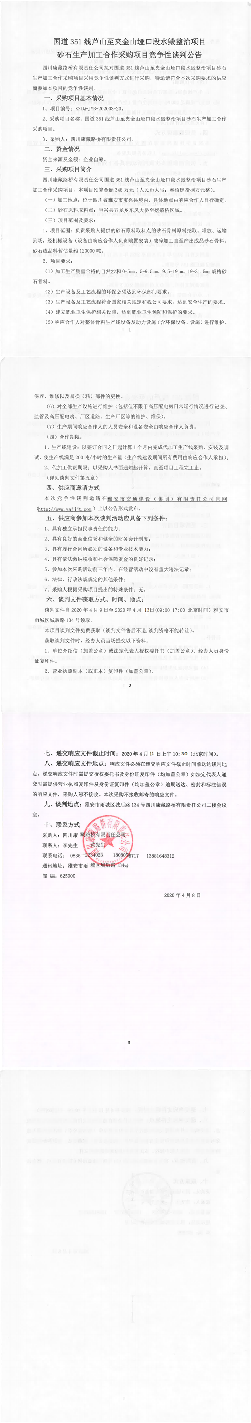 四川康藏路橋有限責任公司國道351線蘆山至夾金山埡口段水毀整治項目砂石生產(chǎn)加工合作采購項目競爭性談判公告