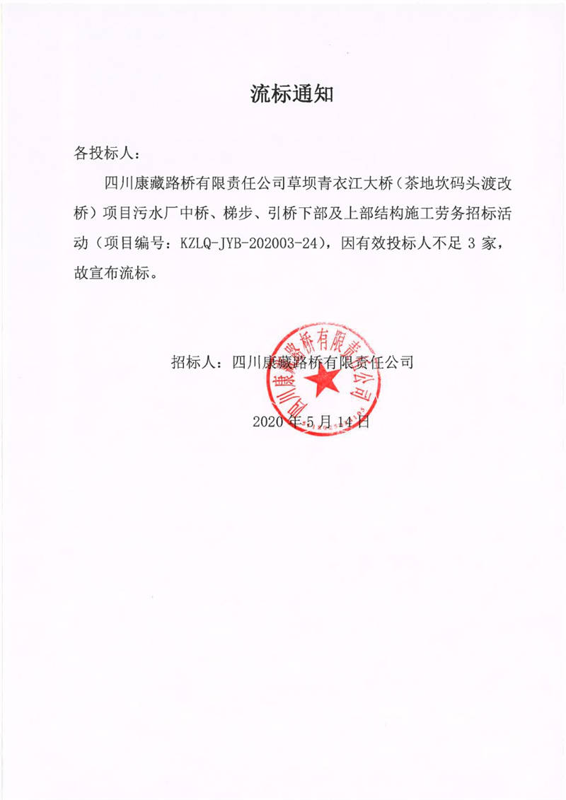 四川康藏路橋有限責任公司草壩青衣江大橋(茶地坎碼頭渡改橋)項目污水廠中橋、梯步、引橋下部及上部結(jié)構(gòu)施工勞務流標通知