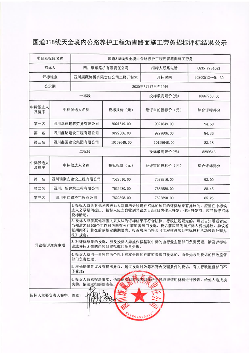 四川康藏路橋有限責(zé)任公司國(guó)道318線(xiàn)天全境內(nèi)公路養(yǎng)護(hù)工程瀝青路面施工勞務(wù)招標(biāo)評(píng)標(biāo)結(jié)果公示