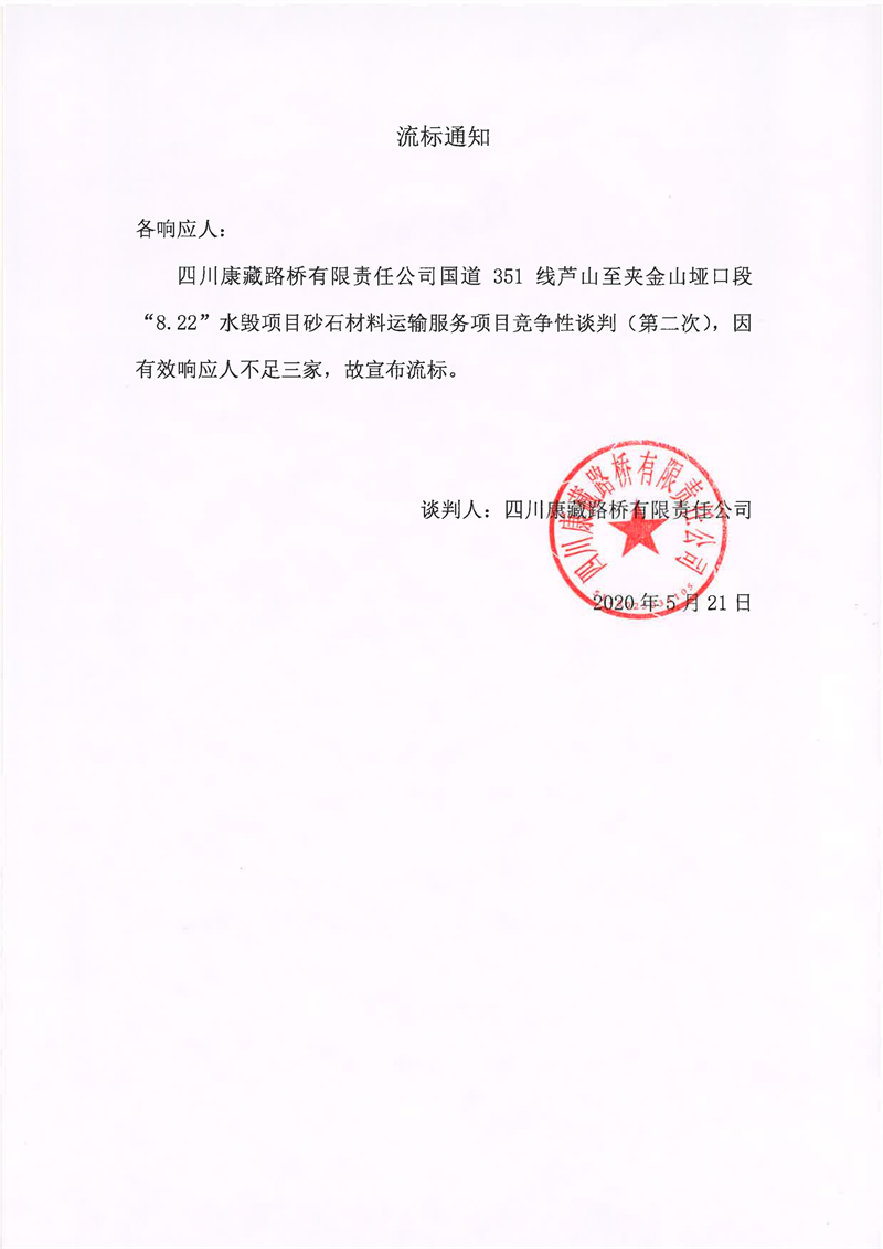 四川康藏路橋有限責(zé)任公司國道351線蘆山至夾金山埡口段8.22水毀項目砂石材料運(yùn)輸服務(wù)項目(第二次)流標(biāo)通知