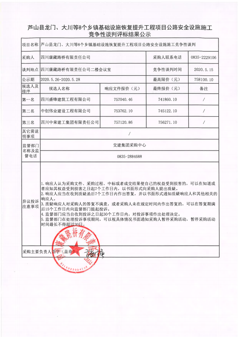 四川康藏路橋有限責(zé)任公司蘆山縣龍門、大川等8個鄉(xiāng)鎮(zhèn)基礎(chǔ)設(shè)施恢復(fù)提升工程項目公路安全設(shè)施施工競爭性談判評標結(jié)果公示